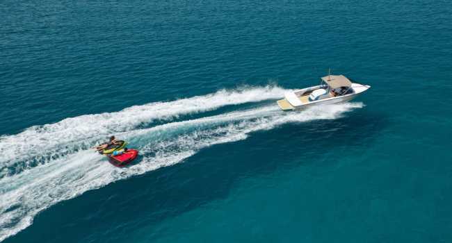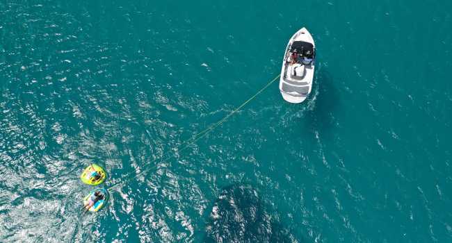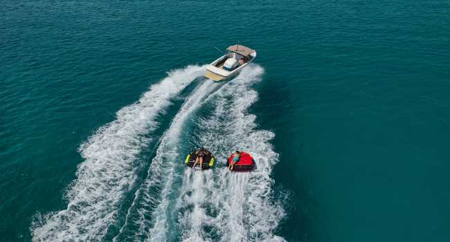 This activity is suitable for families and just about anyone, as it is not very fast-paced. Prior to the commencement of the experience, you will be accompanied by highly skilled instructors who will provide guidance and support. Please wear your safety jackets and hold on tightly as you will be towed away from the shore. Experience the exhilaration of gliding through the waters and hold on tight for the most thrilling 15-minute ride of your life.