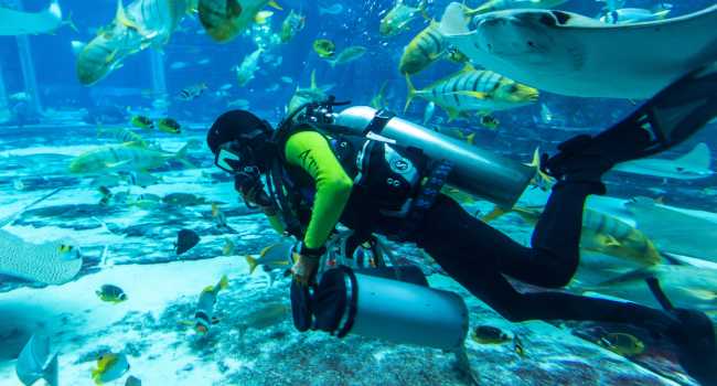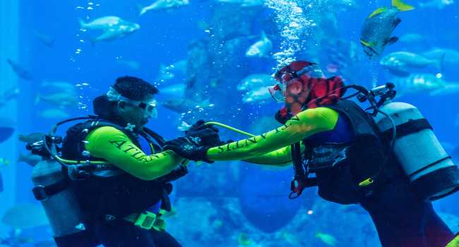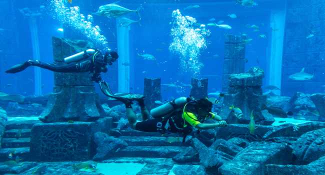 With the help of our trained diving teachers, you can go to Jumeirah Beach and scuba dive to explore the water. Enjoy a 30-minute talk about safety and how to use the gear, followed by information about scuba diving. The PADI-recognized scuba diving Dubai tour shows you the mysterious beauty of the underwater world in a way that no other tour can. It also includes expert help and safety rules. By going as deep as 40 feet into the beautiful underwater world, you can see the bright reefs and strange sea life.